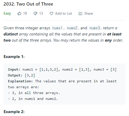 vector<int> twoOutOfThree(vector<int>& nums1, vector<int>& nums2, vector<int>& nums3) {