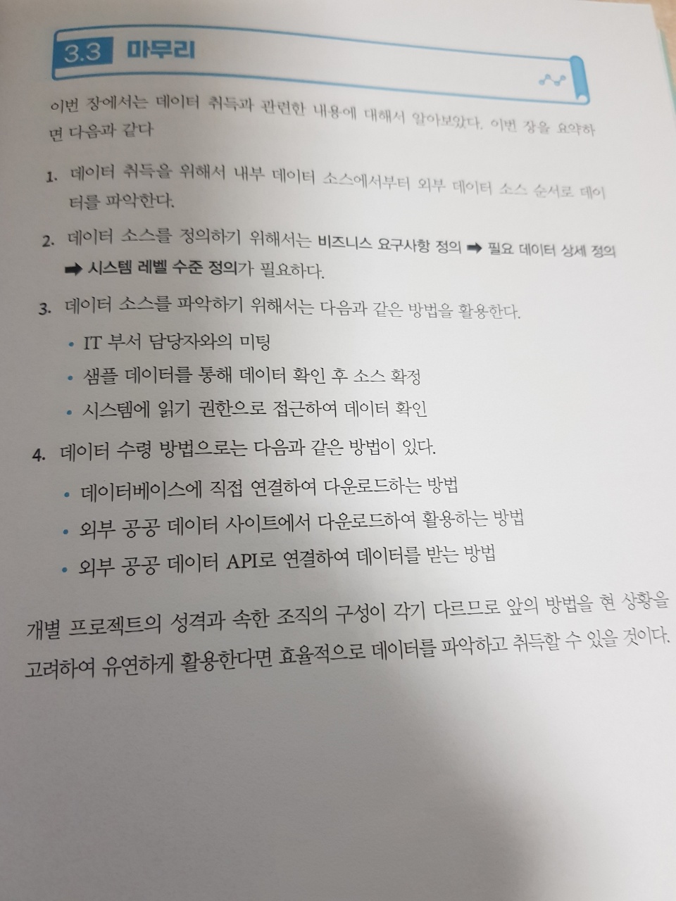 공공 데이터 포탈이나 기업의 ERP, CRM에 통하여 데이터를 확보할 수 있다. 데이터를 확보하고 데이터 전처리를 통하여 의미 있는 데이터를 가공할 때 생기는 데이터 품질관리에 대해서도 설명이 잘되어 있다. 데이터를 확보하여도 물리적 혹은 논리적 오류가 있을 수가 있다. 예를 들면 중복되거나 관련 없는 데이터라던지 수집된 데이터에서 과도하게 벗어난 값, 혹은 데이터가 누락되어 이상치가 발생한 경우가 그 예이다.