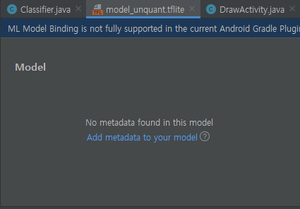 혹시 누군가 비슷한 문제를 겪을지 몰라 포스팅을 남긴다. TensorFlow Lite에서 모델을 추론할 때 모델의 INPUT 사이즈를 꼭 확인하고 처리해야 한다. 안드로이드 스튜디오에서 tflite 모델 파일을 클릭하면 모델정보를 알 수 있다. 하지만 모델을 만든 개발자가 메타데이터를 입력을 하지 않으면 아래 처럼 모델에 대한 정보를 알 수 없다. 메타데이터를 넣어 주는 것이 추후에 디버깅하거나 모델을 사용할때 유추하게 편할거같다.