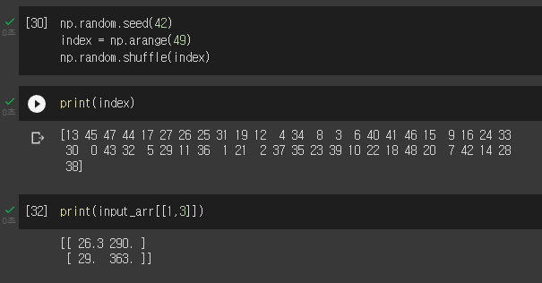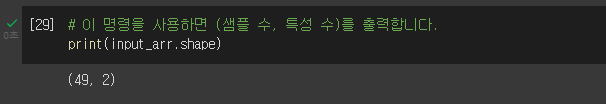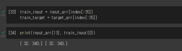 슬라이싱 연산으로 인덱스 0~34까지 처음 35개 샘플을 훈련 세트로 선택, 인덱스 35~48까지 나머지 14개 샘플을 테스트 세트로 선택하고 모델을 훈련하고 평가해 보겠습니다.