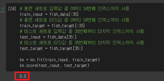 score 의 값이 0 나온다. 이유는? train 데이터와 test 데이터를 확인해 보면 알 수 있다. 샘플링 편향이 생긴 문제이며 훈련세트와 테스트 세트를 나눌때 도미와 빙어 데이터가 골고루 섞이게 했어야 한다. 일반적으로 훈련 세트와 테스트 세트에 샘플이 골고루 섞여 있지 않으면 샘플링이 한쪽으로 치우쳤다는 의미로 샘플링 편향이라고 부릅니다.
