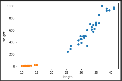 맷플롯립은 친절하게 2개의 산점도를 색깔로 구분해서 나타냅니다. 노란색 점이 빙어의 산점도입니다.