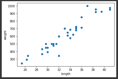 생선의 길이가 길수록 무게가 많이 나간다고 생각하면 이 그래프 모습은 매주 자연스럽습니다. 이렇게 산점도 그래프가 일직선에 가까운 형태로 나타나는 경우를 선형(linear)적이라고 말합니다. 머신러닝에서는 선형이라 단어가 종종 등장합니다.