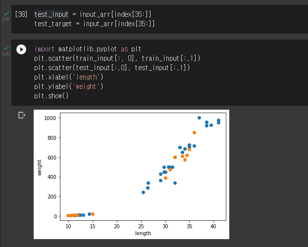 파란색이 훈련 세트이고 주황색이 테스트 세트입니다. 양쪽에 도미와 빙어가 모두 섞여있는 것을 확인 할 수 있습니다.