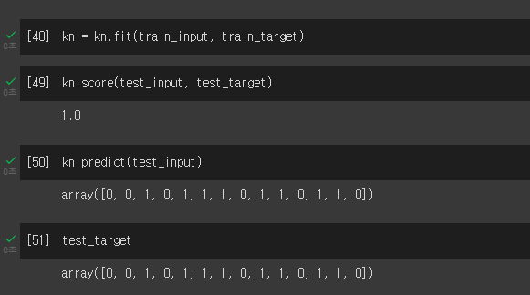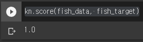 이제 사이킷런 패키지에서 k-최근접 이웃 알고리즘을 구현한 클래스인 KNeighborClassfier를 임포트 하여 훈련을 하고 출력하겠습니다.