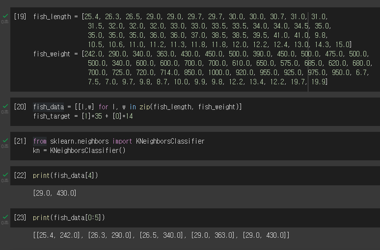 k-최근접 이웃 알고리즘을 사용해 도미와 빙어 데이터를 구분하겠습니다. k-최근접 이웃 알고리즘을 사용하기 전에 앞에서 준비했던 도미와 빙어 데이터를 하나의 데이터로 합치겠습니다. 파이썬에서는 다음처럼 두 리스트를 더하면 하나의 리스트로 만들어 줍니다.