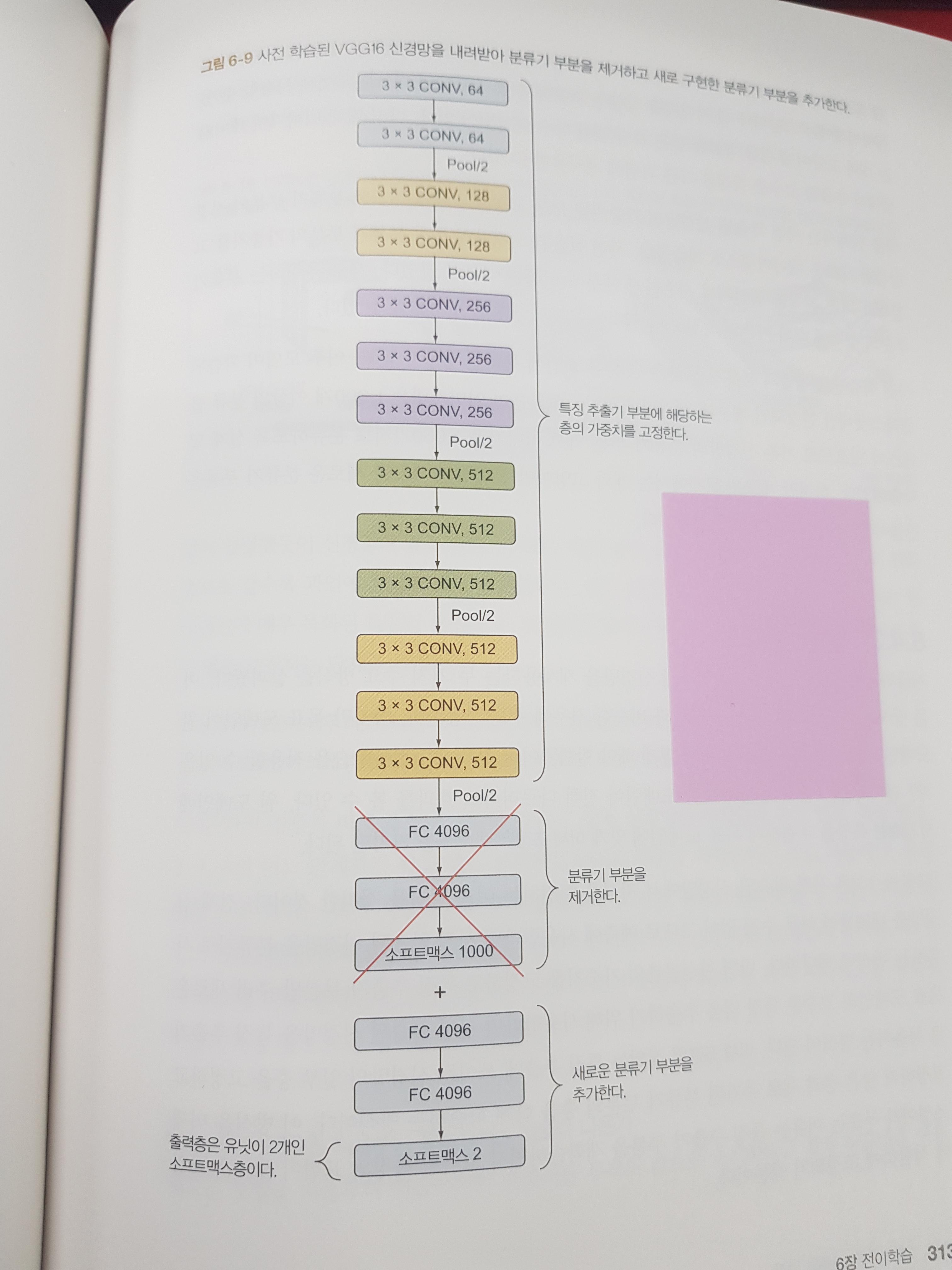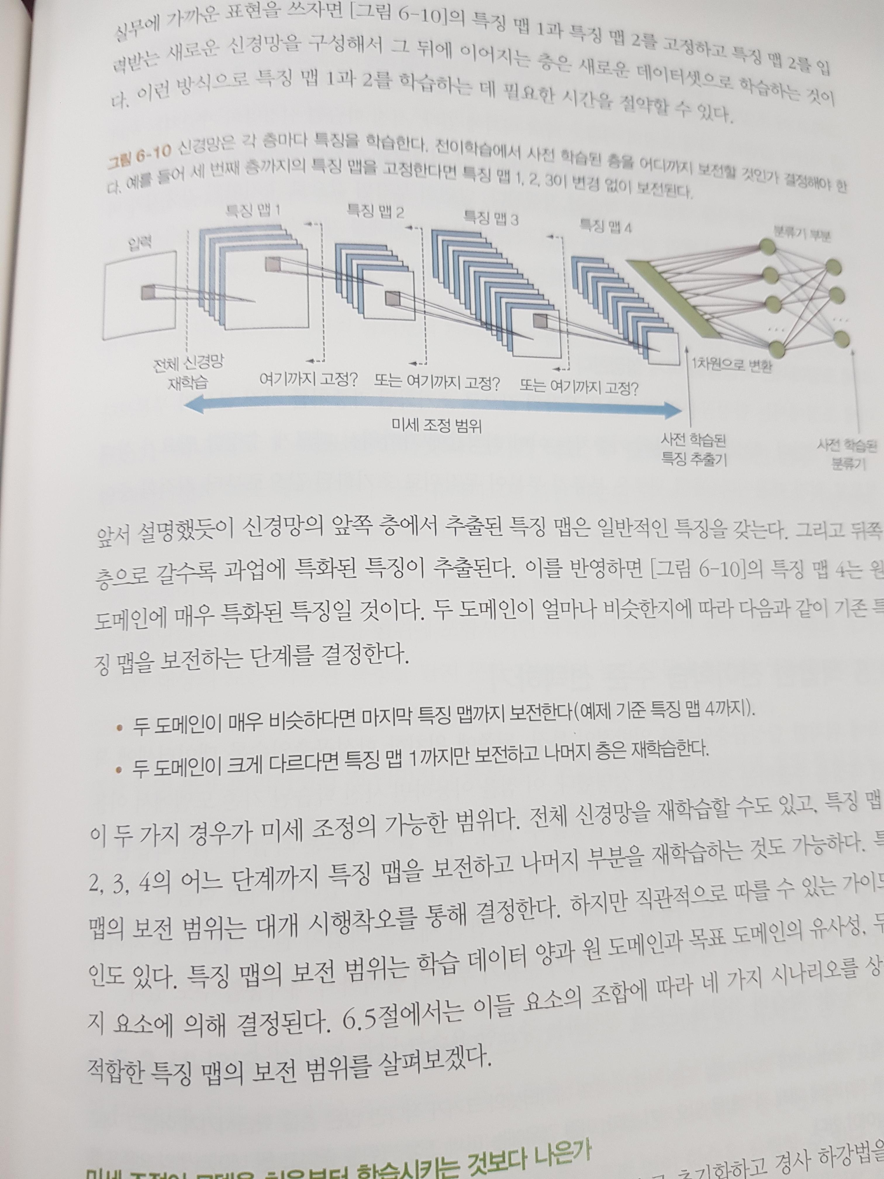 전이 학습을 진행할 때 수준을 결정하는 시나리오에 대해서 설명하며 기존의 오픈 소스 데이터셋 중 이미지 넷, MS COCO, 오픈 이미지, MNIST, CIFAR 등의 데이터셋을 소개한다. 또한 미세 조정을 위한 파인 튜닝 기법을 각 층마다 그리고 출력층마다 도식화하며 설명한다.