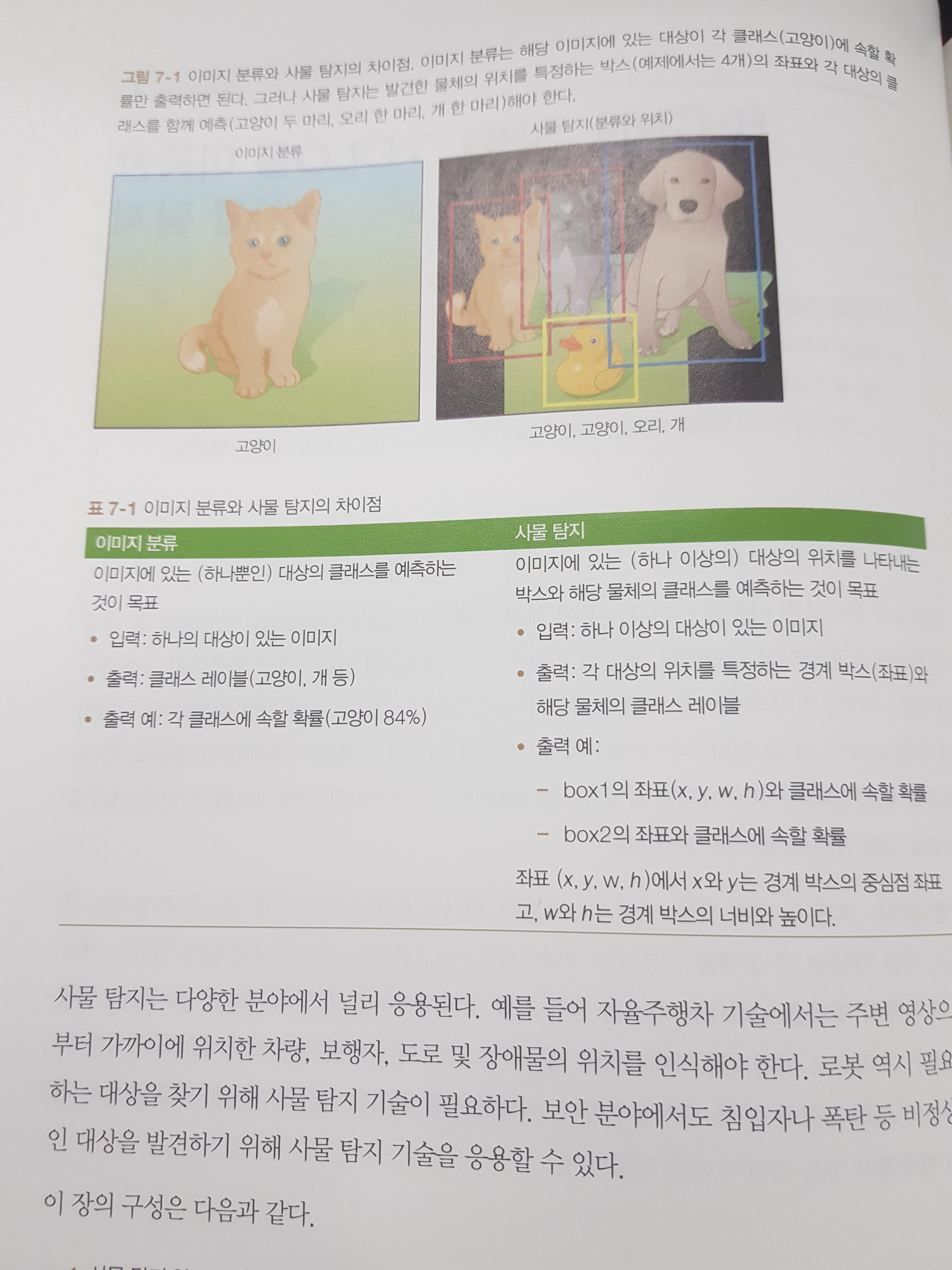 7장은 단순한 이미지 분류가 아닌 사물 탐지 알고리즘 기반의 신경망을 소개한다. 이미지 분류는 이미지에 있는 하나의 물체 종류 또는 클래스를 예측이 목표이며 사물 탐지는 이미지 속 물체의 위치를 경계 박스를 통해 예측하고 그와 더불어 해당 물체의 클래스를 목표이다. 사물 탐지 모델은 R-CNN부터 시작되었으며 정확도와 추론 속도에 따라 사용처가 달라지게 된다. R-CNN -> FAST-R-CNN -> Faster-R-CNN 등 R-CNN의 모델의 발전된 방향을 예시를 들면 설명한다.