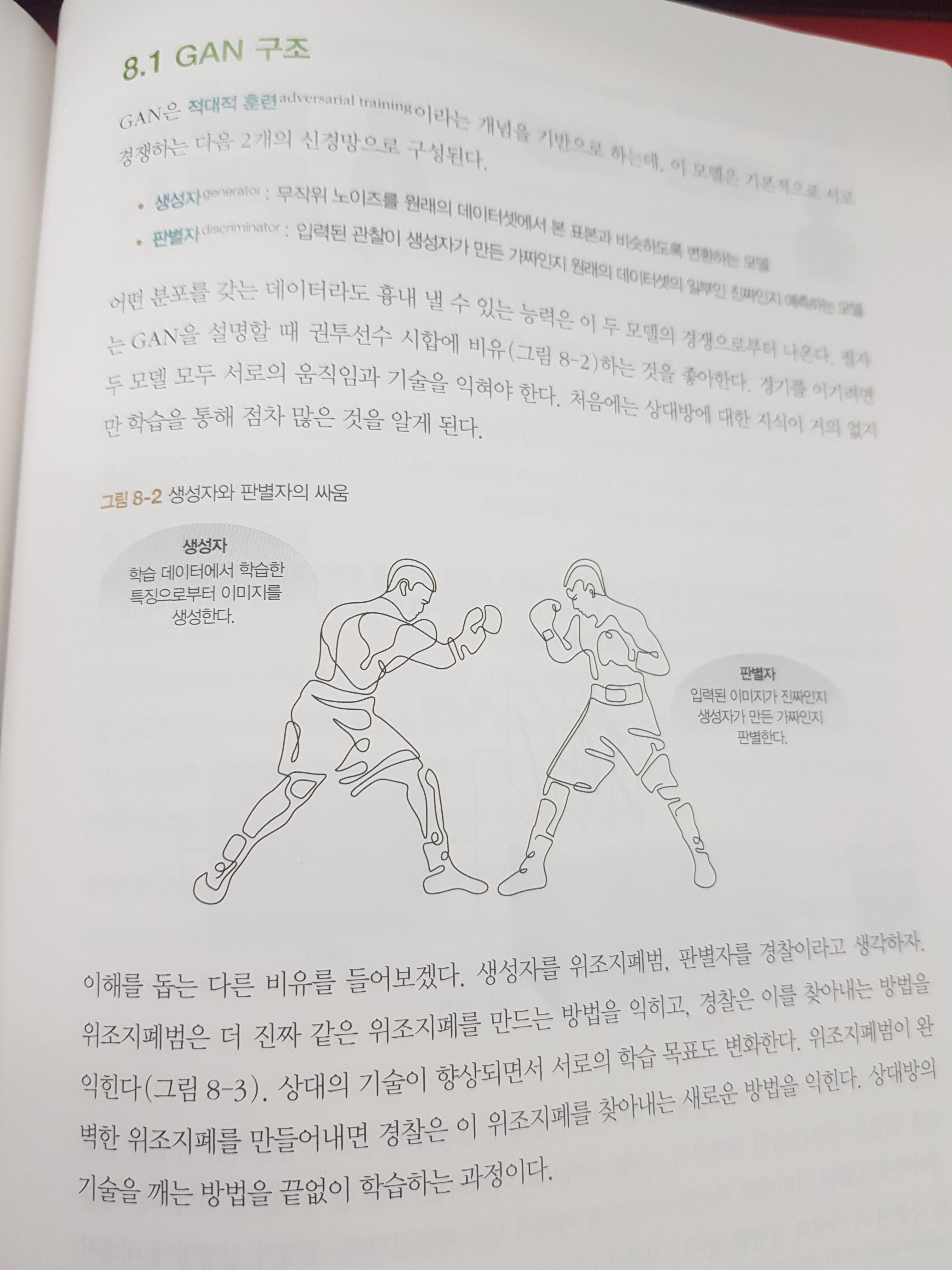 GAN은 데이터의 패턴을 학습해서 훈련 데이터와 비슷한 분포를 지닌 새로운 이미지를 만든다. GAN은 서로 경쟁하는 2개의 신경망으로 구성되며 생성자 모델과 판별자 모델로 하여금 새로운 이미지를 생성한다.
