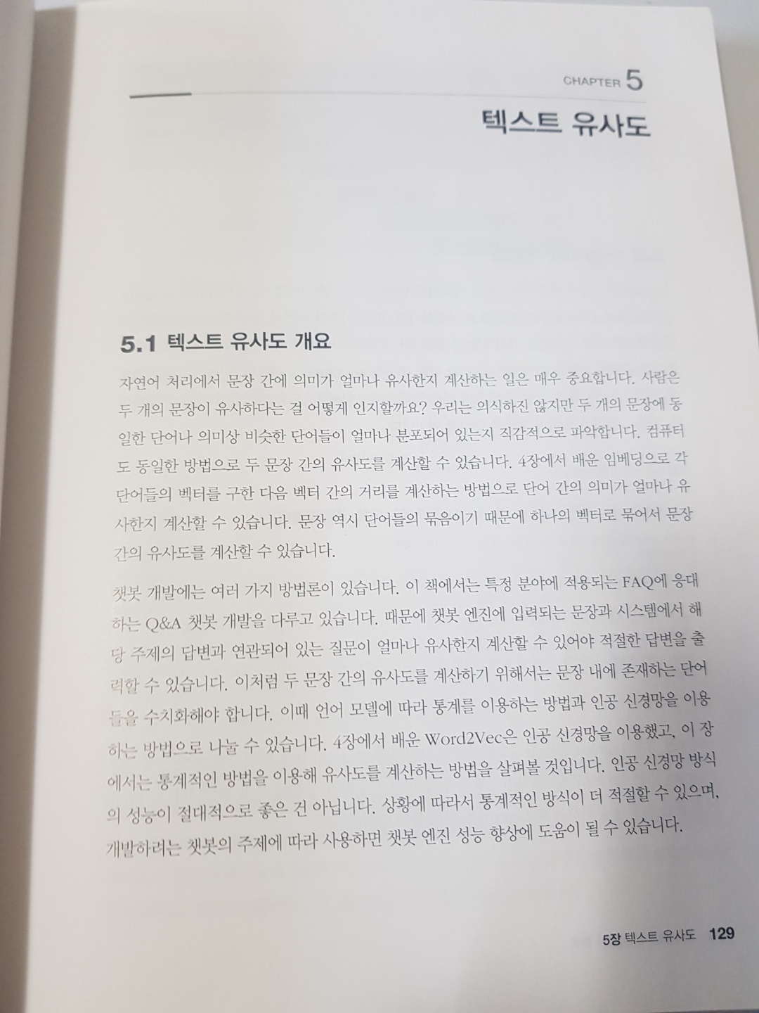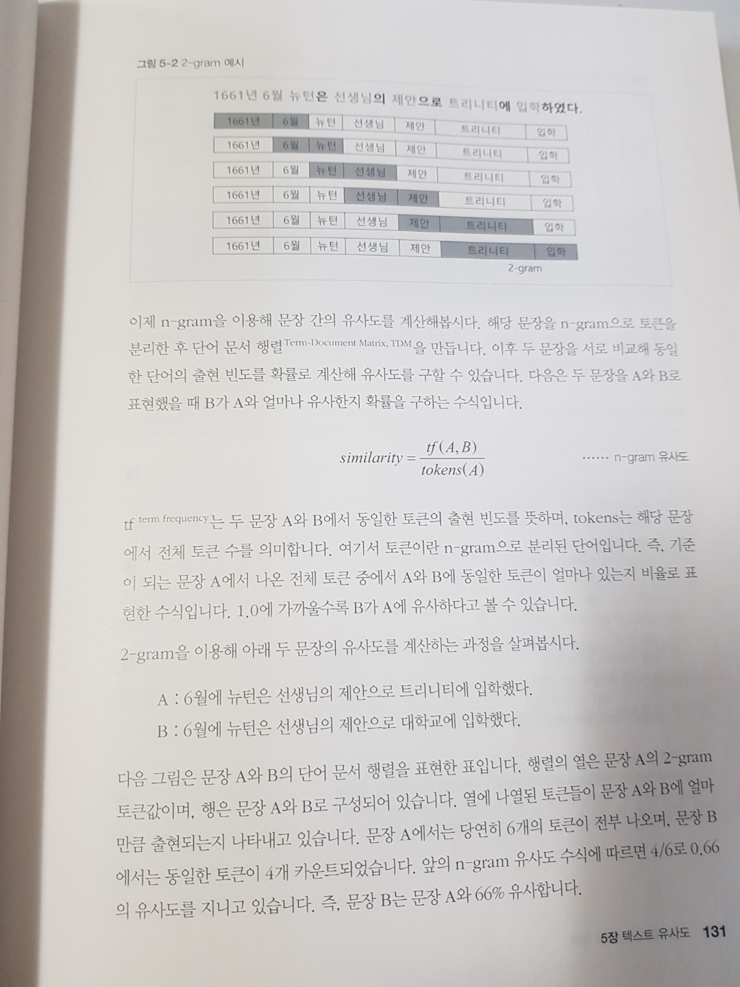 Chapter 5장 에서는 텍스트 유사도에 소개한다. 두 문장 간의 유사하다는 것을 판단하는 기법 중 N-Gram, 코사인 유사도 등의 기법을 일반인도 쉽게 알 수 있도록 설명되어 있다.