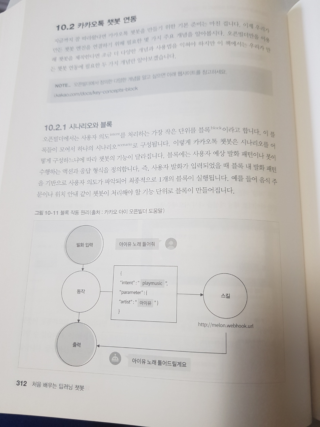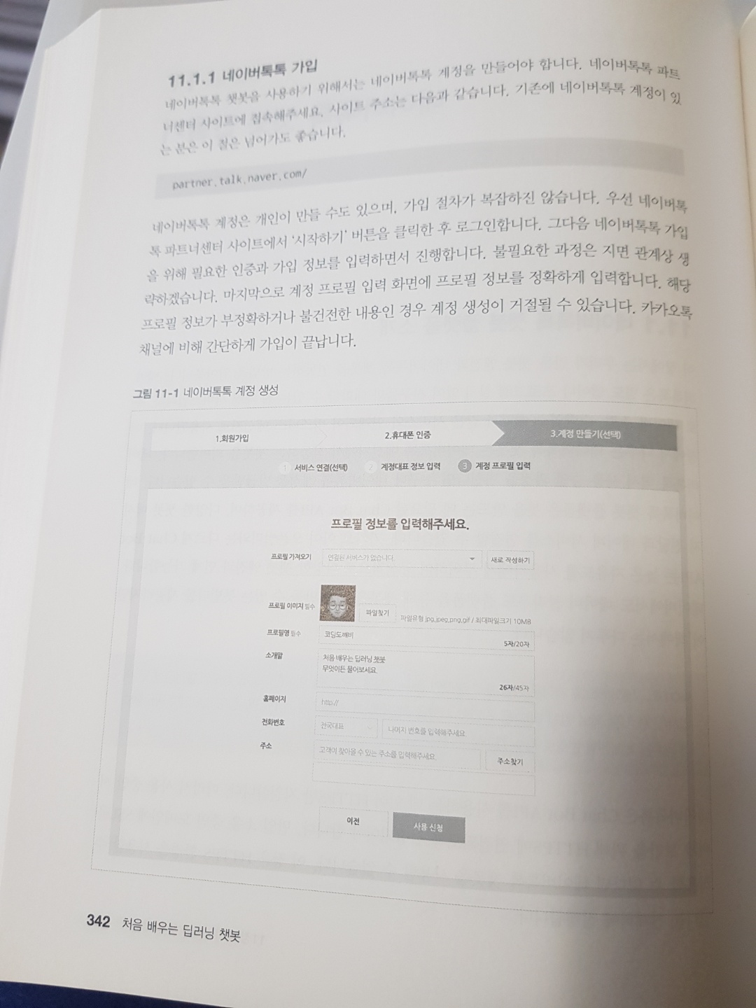 10, 11장은 각각 카카오톡, 네이버 톡톡 등의 실제 서비스에서 챗봇을 만드는 과정에 대해서 기술되어 있으며 해당 챕터는 직접 실습을 통하여 서비스를 이용하여 봇을 만드는 것을 추천한다.