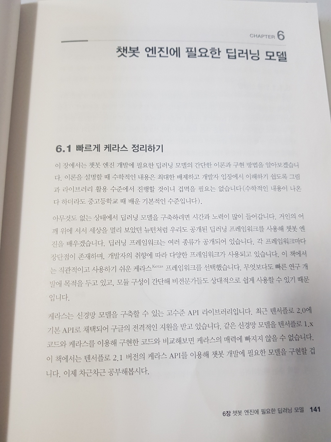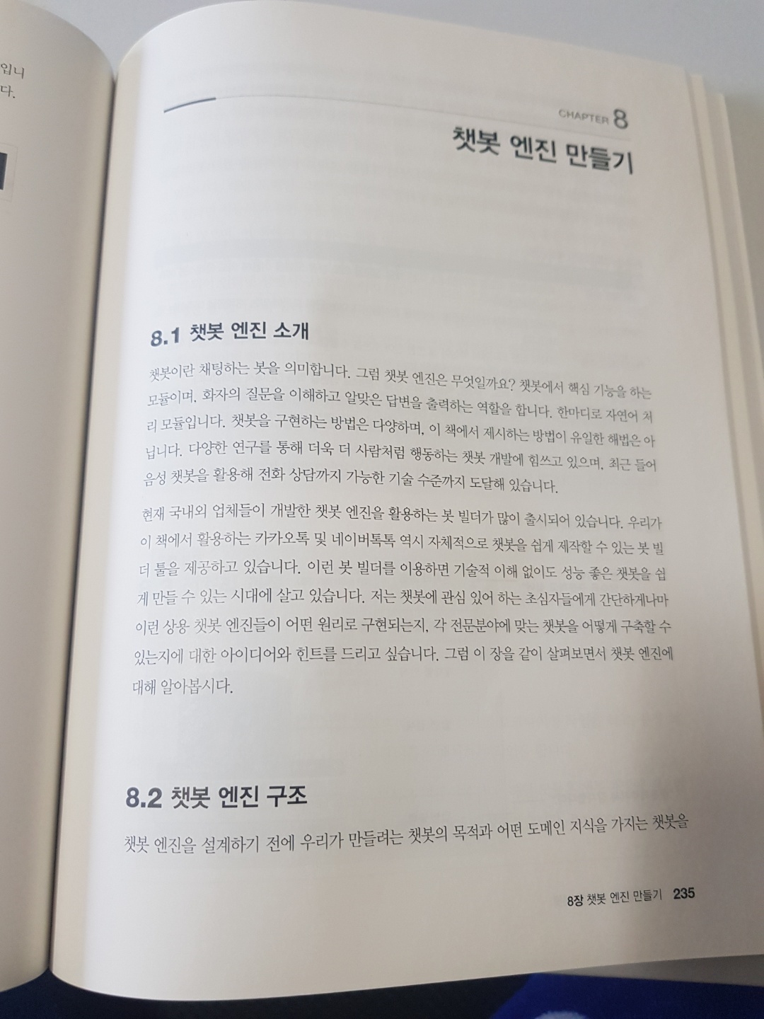자연어 처리 내부를 몰라도 KoNLPy 등 자연어 처리 프레임워크를 사용하여 단어 및 문장을 학습하는 방법을 알려준다. 또 한, 학습한 모델을 기반으로 카카오톡, 네이버 톡톡 등을 연동하여 실제 서비스에 적용할 수 있는 가이드라인을 제시한다. 해당 책은 자연어 처리의 깊은 원리 설명은 없지만 서비스를 적용할 수 있는 기초적인 원리를 설명하고 딥러닝뿐만 아니라 직접 서버를 구축하여 REST API로 서비스를 제공하는 방법에 대한 기술 되어 있다.