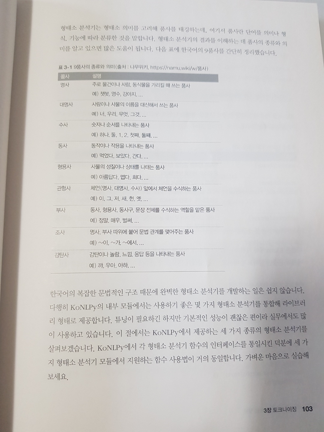 Chapter 3장에서는 토큰나이즈에 대해서 용어 정리되어 있다. 컴퓨터가 자연어를 직접적으로 이해할 수 없기에 자연어의 의미를 분석해 컴퓨터가 처리할 수 있도록 하는 일이 필요하다. 한국어 문장을 분석하려면 토큰 단위는 어떻게 정의해야 하는지에 따라 자연어 처리에 성능이 영향을 미치게 된다. 형태소를 토큰 단위로 사용하여 자연어 처리하는 방법을 KoNLPy, KKma, Komoran, Okt 등의 형태소 분석기로 실습을 하며 각 형태소 분석기들의 장단점에 대해서 정리되어 있다.