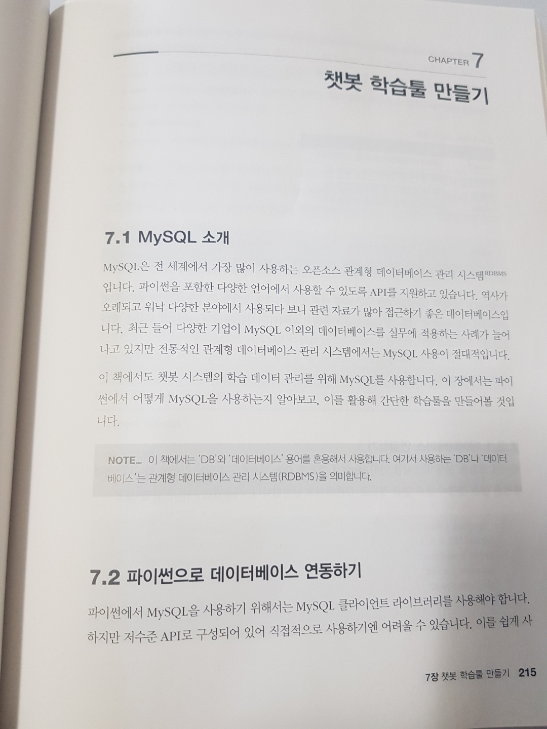Chapter 7장부터는 실제 챗봇 시스템을 만들기 위한 설계 및 구현 위주로 설명되어 있다. Chapter 7장은 MySQL과 파이썬을 이용하여 쳇봇 학습 데이터 툴을 만드는 설계 및 구현에 대해서 소개한다. 8장은 직접 데이터를 학습하며 단어 인식 및 엔진을 만드는 구현 코딩 위주로 설명되어 있으며 챗봇 엔진을 만들고 이를 서버로 만드는 방법에 대해서 설명한다. 9장에서는 Flask를 이용하여 Rest API 서비스를 구현에 필요한 개발환경에 대해 소개한다.