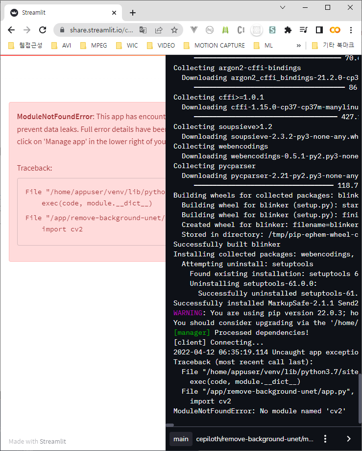 STREAMLIT 을 이용하여 웹에 배포시에 위와 같은 오류가 발생 하였다.