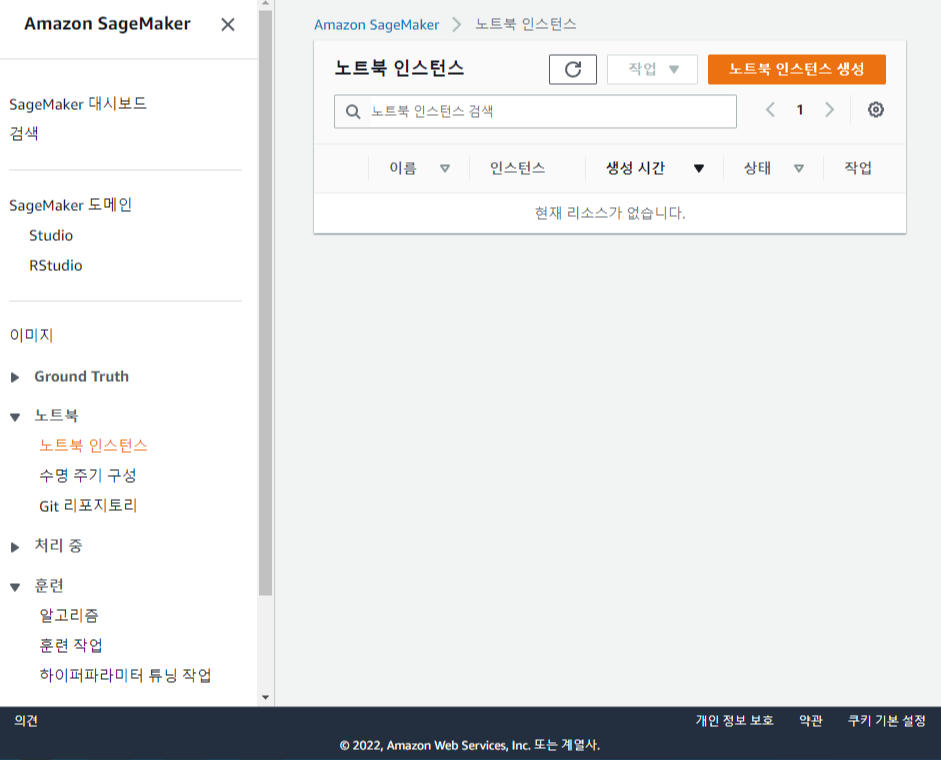 Amazon SageMaker에서 노트북을 사용하려면 먼저 노트북 인스턴스를 생성해야 합니다. SageMaker 콘솔 메뉴에서 [노트북 인스턴스]를 선택하고 화면에서 [노트북 인스턴스 생성] 버튼을 클릭합니다.