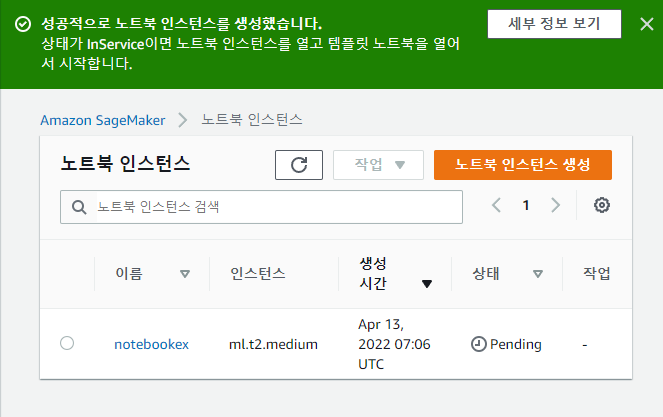 노트북 인스턴스가 만들어질 때까지 시간이 걸립니다. 노트북 인스턴스 상태는 생성 버튼을 클릭한 직후에는 Pending 상태이고 인스턴스 생성이 완료되면 InService 상태가 됩니다.