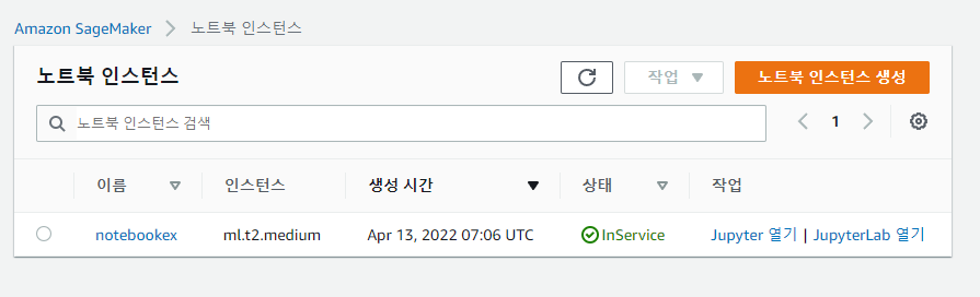 InService 상태가 되면 아래처럼 Juypyter 열기 혹은 Jupyter Lab 열기로 노트북을 실행할 수 있다.
