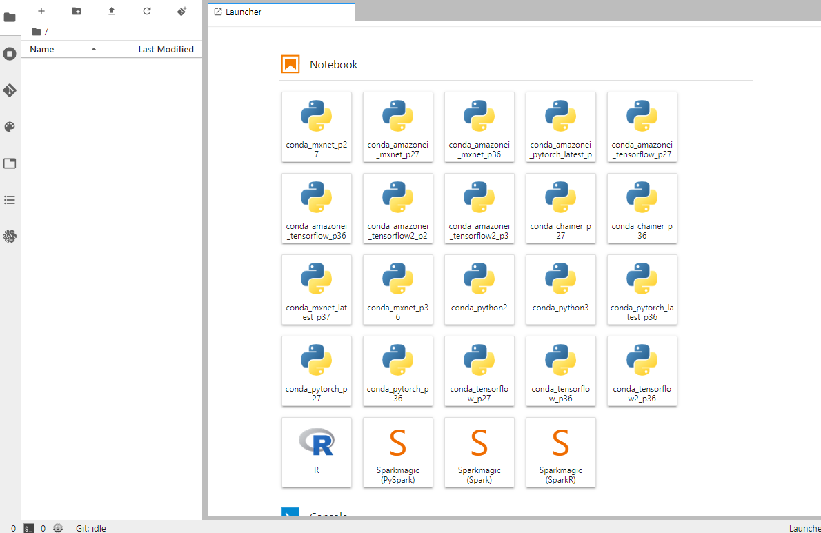SageMaker 노트북에는 Python 2와 3의 환경뿐만 아니라 TensorFlow, Chainer, PyTorch 같은 기계학습 프레임워크가 이미 도입된 환경도 준비되어 있습니다. 또한 표준 Python 2와 3 환경에서도 Numpy나 Pandas 같은 데이터 분석용 라이브러리나 scikit-learn이 도입된 상태로 바로 사용할 수 있습니다.