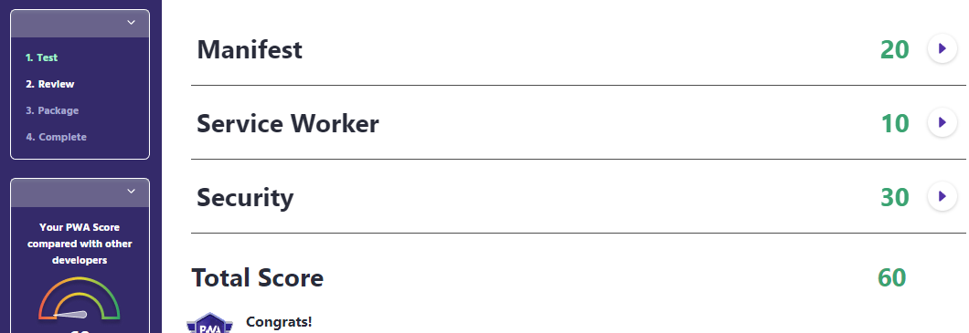 분석이 완료되었는데 제가 만든 웹사이트는 PWA Score 30 점이 나왔습니다. 무엇인가 더 처리할 게 있나 봅니다.