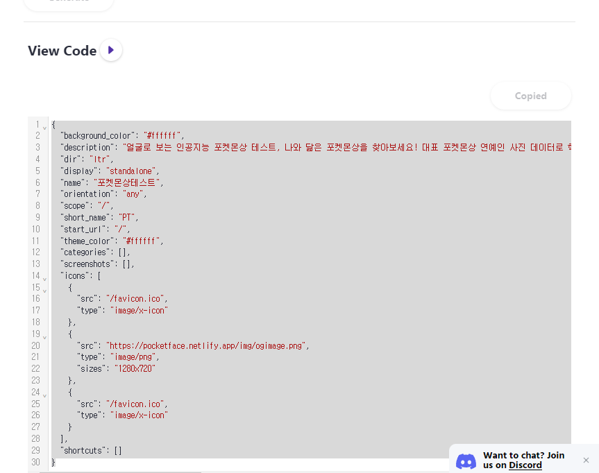 맨 아래로 내려가면 View Code 버튼을 눌러 manifest.json 파일을 생성합니다.