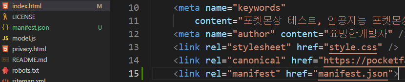 index.html 파일에 방금 생성한 manifest.json 파일을 link 코드를 추가하고 필자의 경우 netlify와 github에 연동되어 있어서 업로드하고 웹 사이트를 재 배포하였습니다.