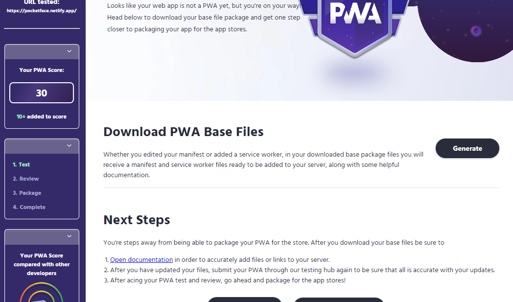 PWABuilder로 돌아와서 Next Button을 클릭하였더니 Download PWA Base Files라는 것이 생성되었습니다. Generate 버튼을 누르면 PWA를 구성하는 Base File을 다운로드할 수 있습니다.