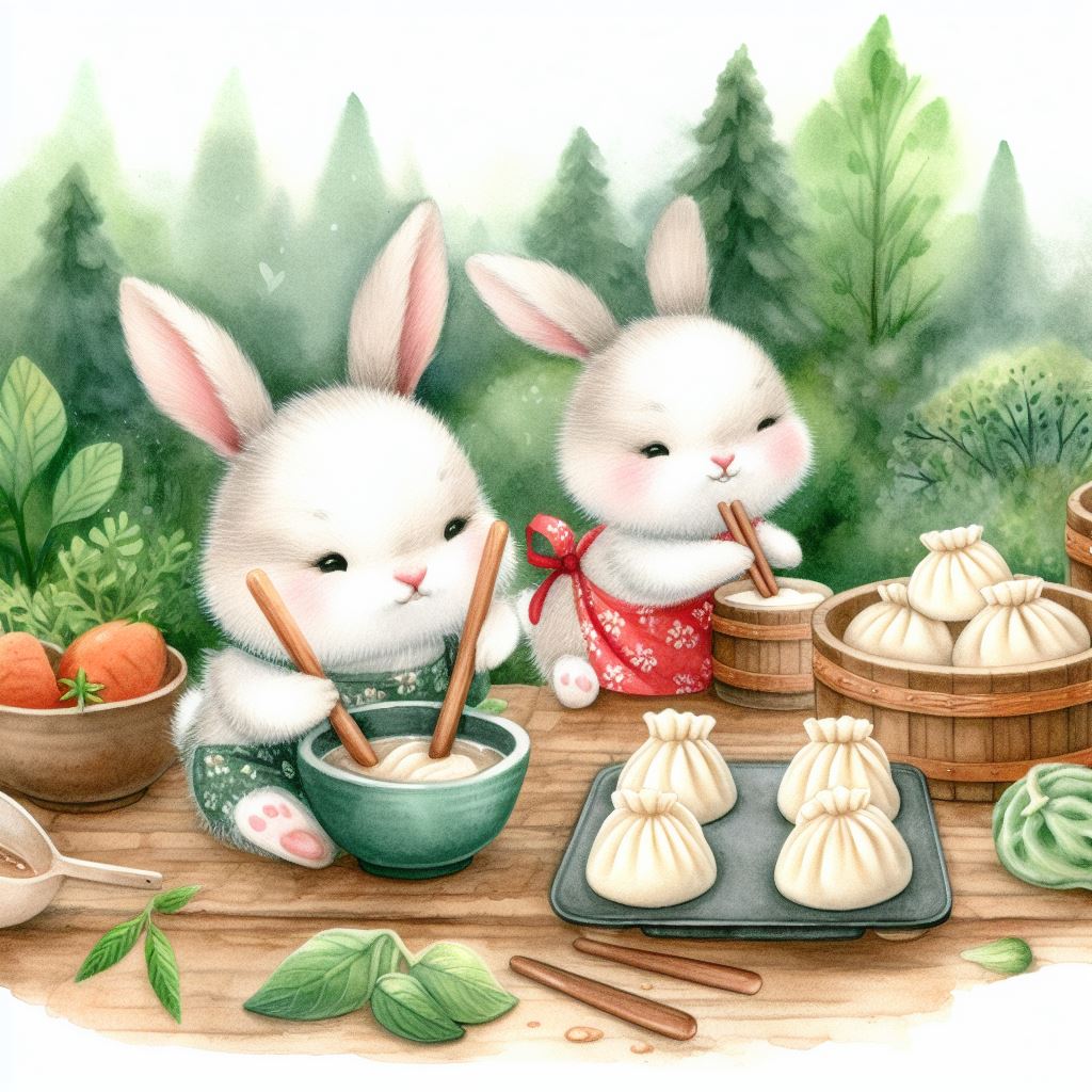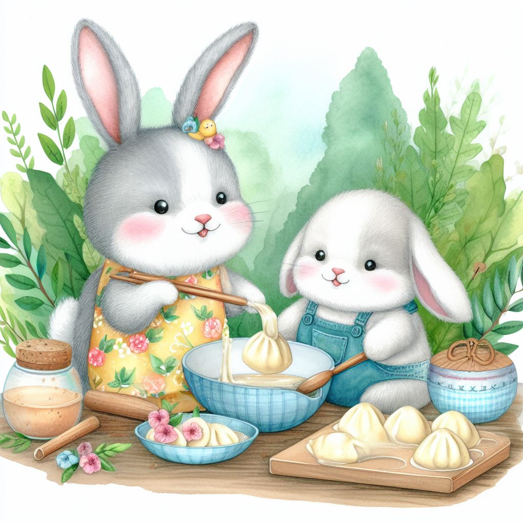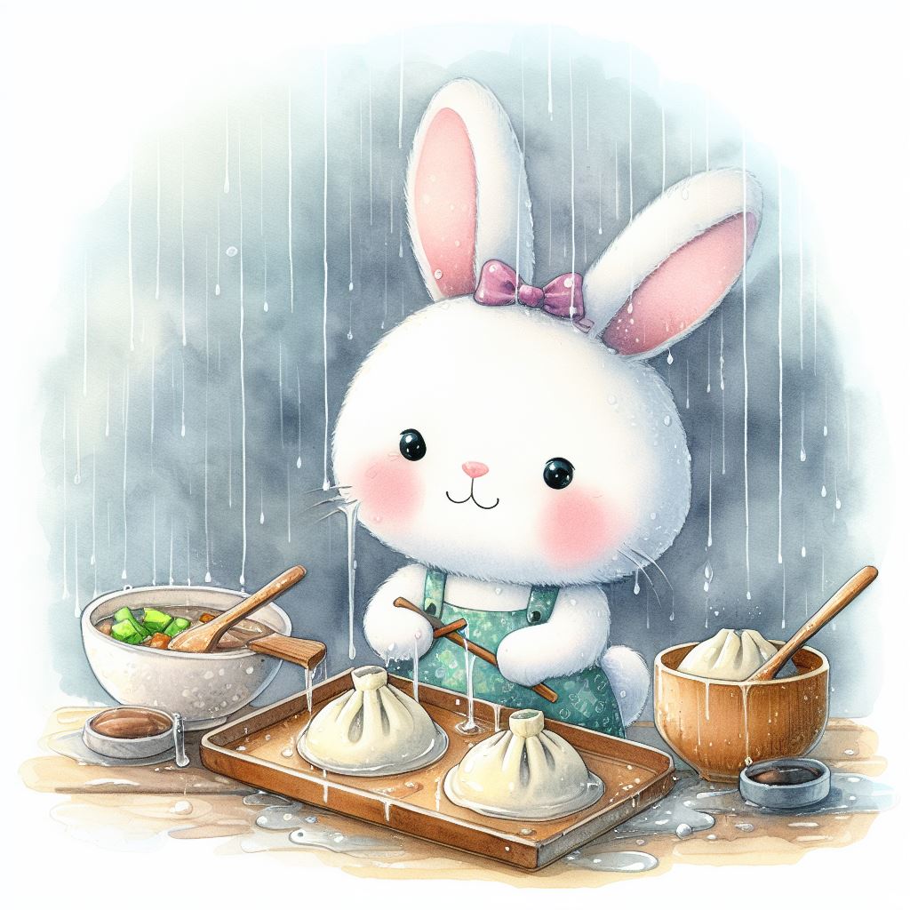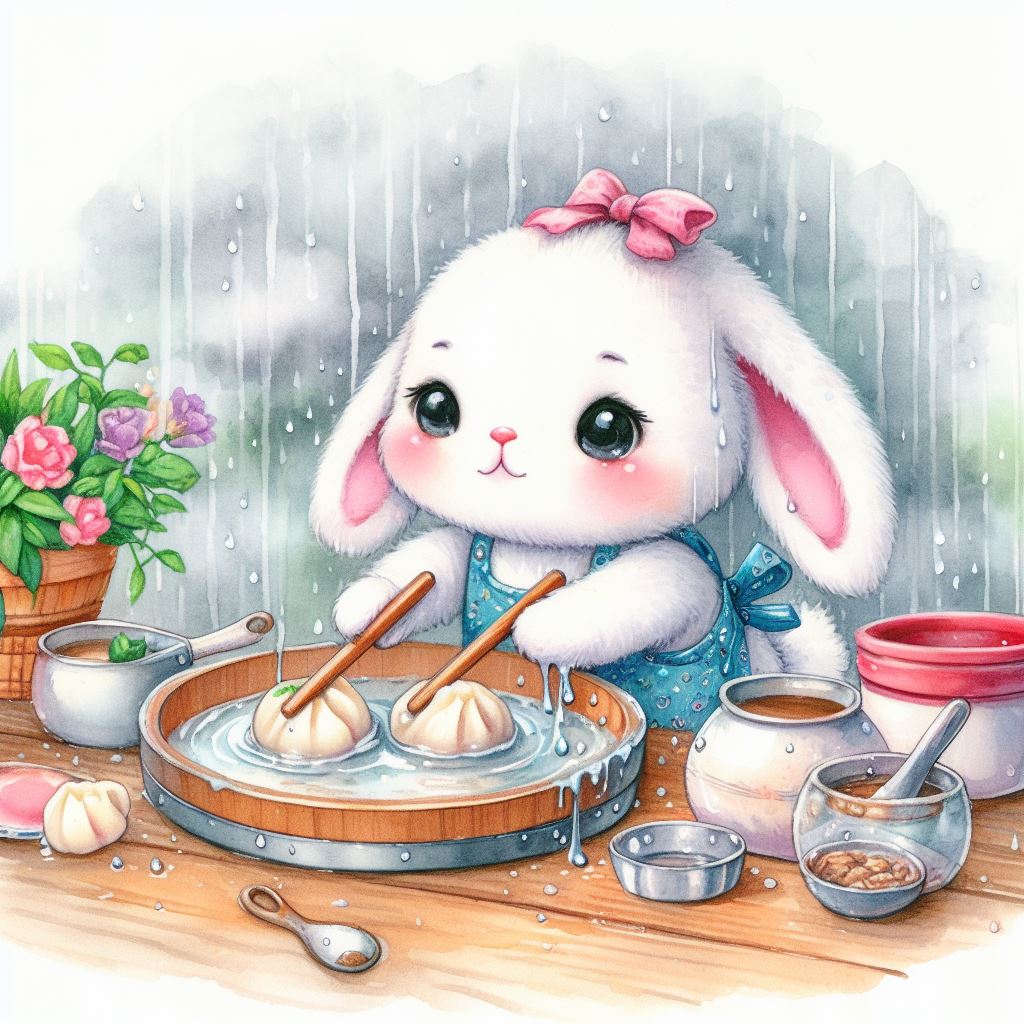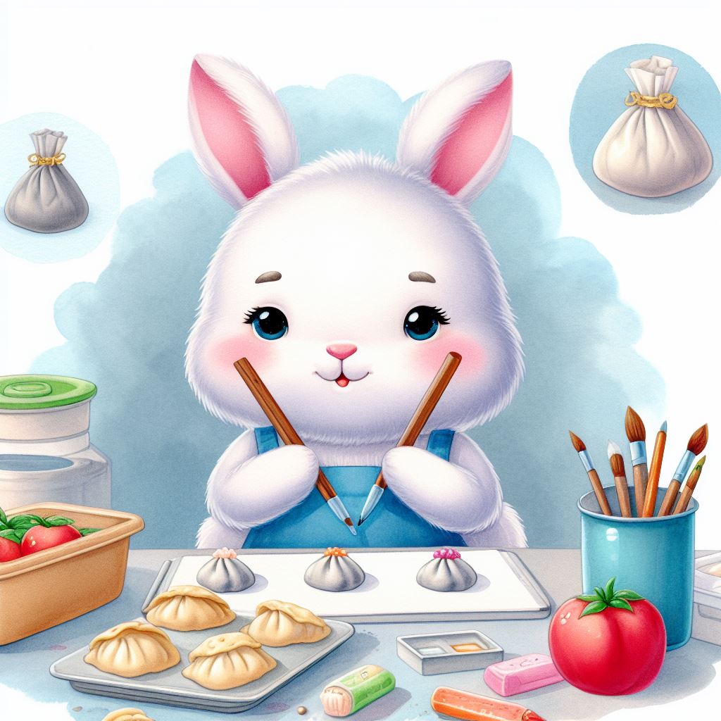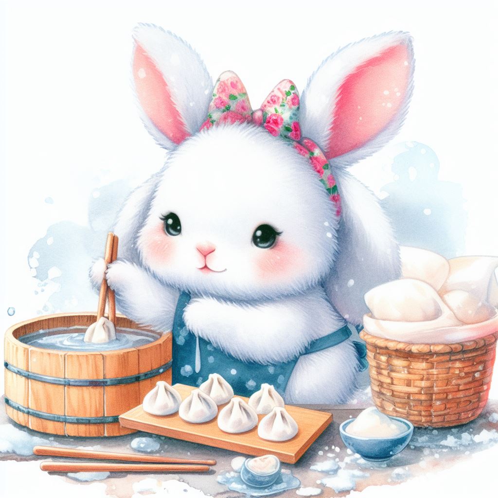 아래는 [만두를 만드눈 토끼, 수채화] 프롬프트를 이용하여서 만든 예시입니다. (산에서, 바다에서, 크리스마스때, 숲속에서 등)