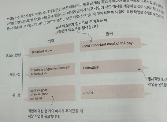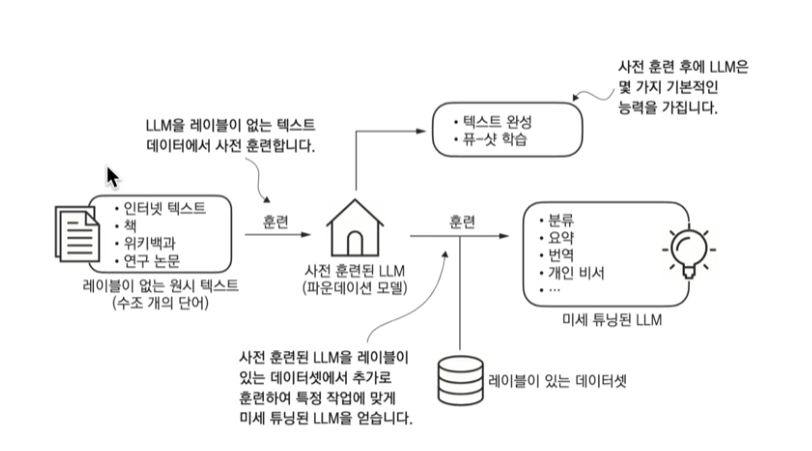- LLM은 일반적으로 크게 보아 비지도 학습 방식을 사용하여 훈련되며, 입력 텍스트를 사용해서 다음 단어를 예측하는 방식으로 사전 훈련됩니다.