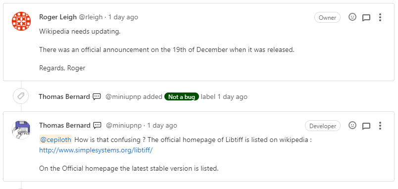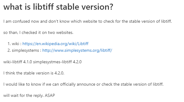 단순하게 생각한다면 4.2.0 버전이 안정적인 버전인 것을 알 수 있지만 확신이 없었다. 그래서 gitlab 포럼에 아래처럼 질문을 하였다. (gitlab.com/libtiff/libtiff/-/issues/234)