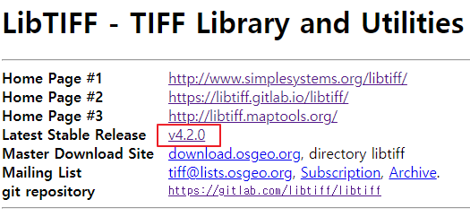 그러나 www.simplesystems.org/libtiff/ 사이트를 확인 시에는 Lastest Stable Release 버전은 4.2.0으로 명시되어 있다.