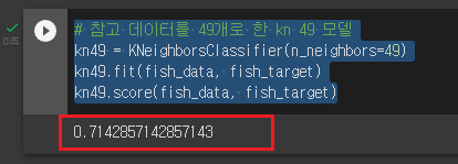 가장 가까운 데이터를 49개를 사용하는 k-최근접 이웃 모델에 fish_data를 적용하면 fish_data에 있는 모든 생선을 사용하여 예측하게 됩니다. 다시 말하면 fish_data의 데이터 49개 중에 도미가 35개로 다수를 차지하므로 어떤 데이터를 넣어도 무조건 도미로 예측할 것이다. n_neighbors 매개변수를 49로 두는 것은 결과가 좋지 않다.
