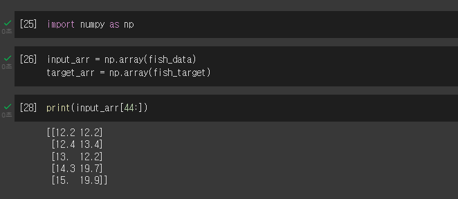 슬라이싱 연산으로 인덱스 0~34까지 처음 35개 샘플을 훈련 세트로 선택, 인덱스 35~48까지 나머지 14개 샘플을 테스트 세트로 선택하고 모델을 훈련하고 평가해 보겠습니다.