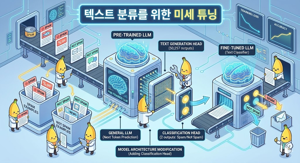반면, 분류 미세 튜닝은 전문적인 분류 작업을 장기간 실행하기 위해, 스팸/넌스팸과 같이 정해진 두 개의 클래스 레이블만 출력하도록 LLM을 만드는 과정입니다.
